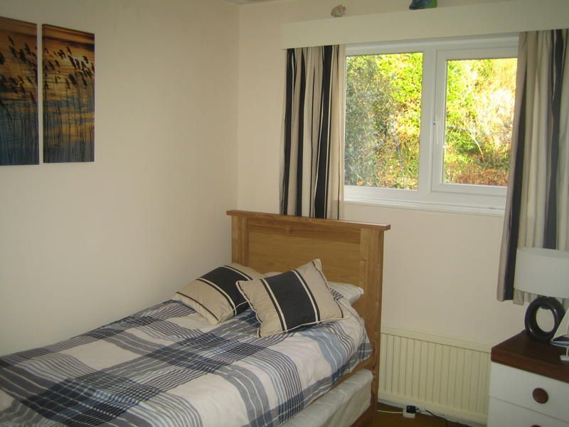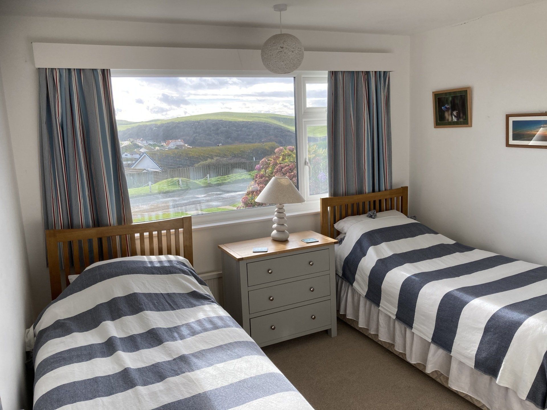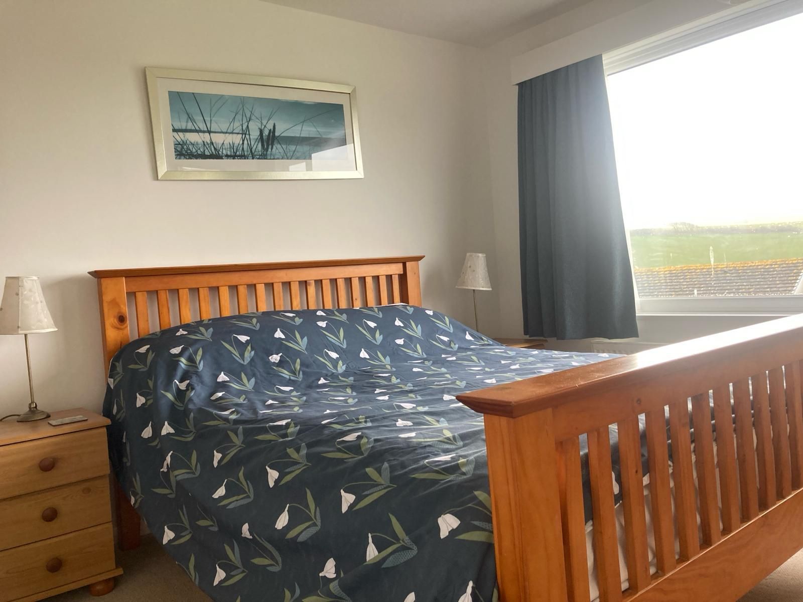 The main bedroom has a kingsize bed and a chest of drawers. The window overlooks the front of the house and looks out onto Bolt Tail.